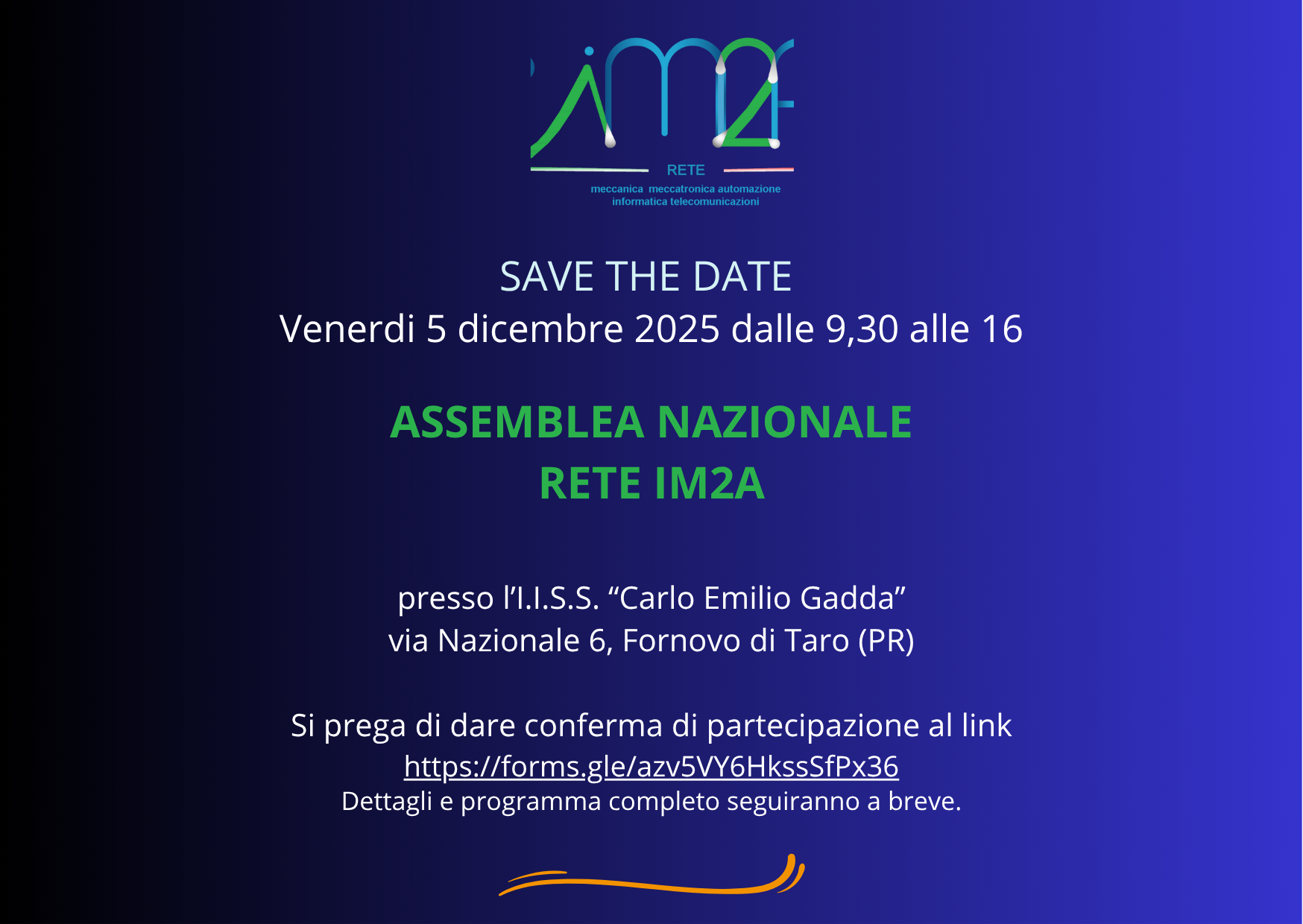 La Rete IM2A invita dirigenti, docenti e referenti degli istituti aderenti all’Assemblea Nazionale 2025, che si terrà venerdì 5 dicembre 2025, dalle 9:30 alle 16:00, presso l’Istituto “Carlo Emilio Gadda” di Fornovo di Taro (PR).